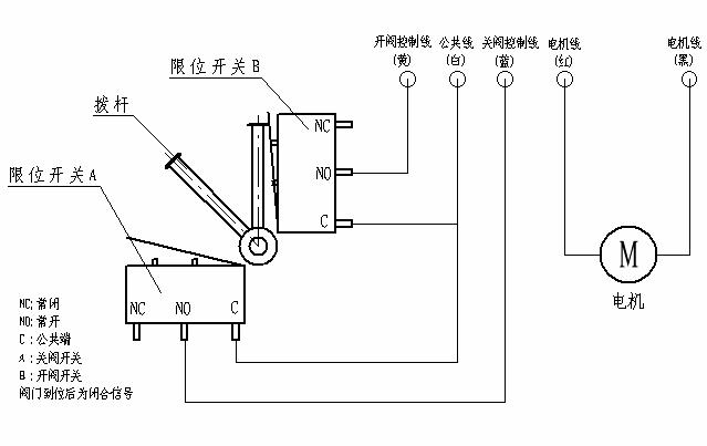 4)執(zhí)行機構引出線中:黑色線為電機正極引出線,紅色線為電機負極引出線,黃色線為開閥到位引出線,藍色線為關閥到位引出線,白色線為閥到位公共線。