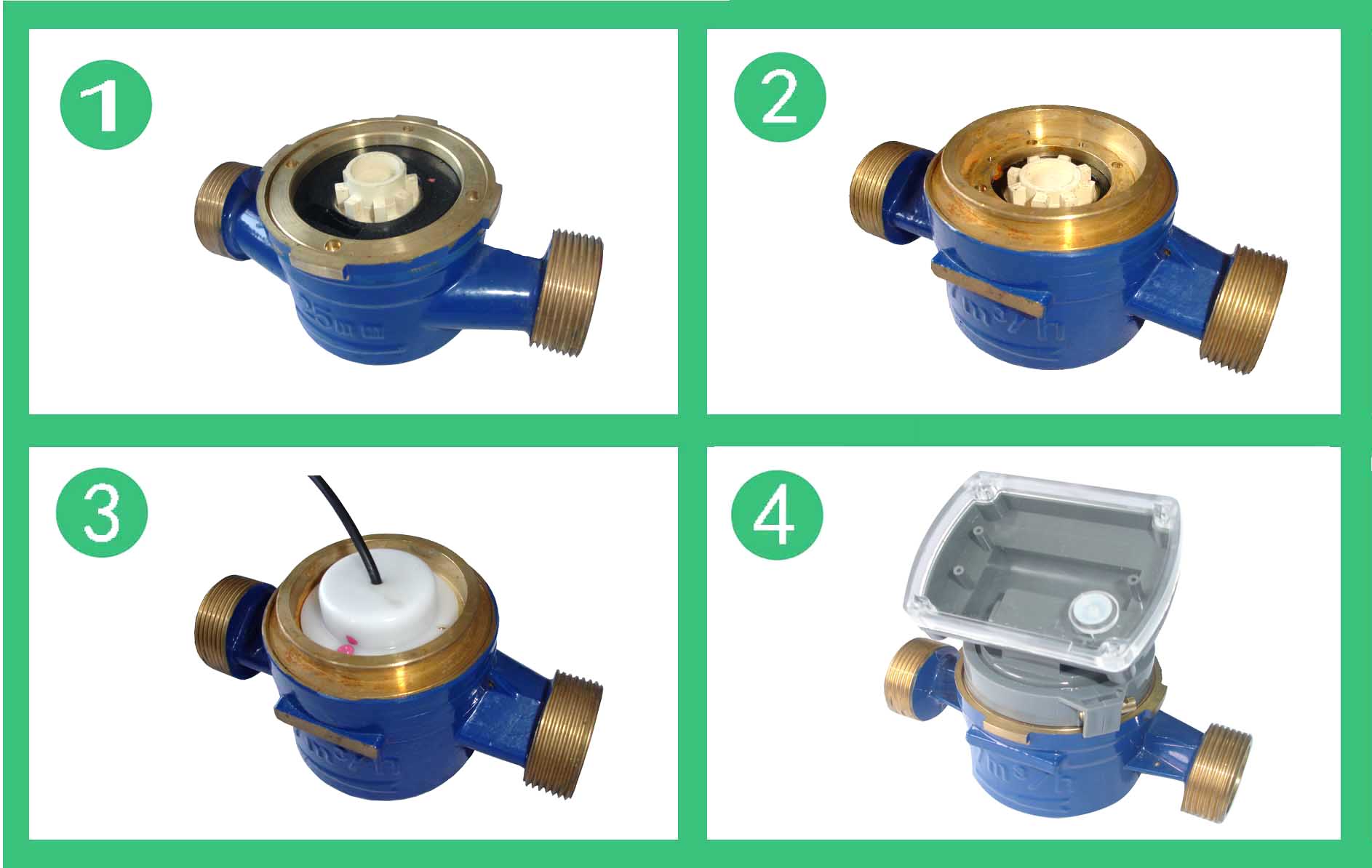 單流束有磁熱量表流量計(jì)的結(jié)構(gòu)如圖,其工作原理是:熱水進(jìn)入流量計(jì),經(jīng)進(jìn)水導(dǎo)向孔沖擊計(jì)量腔內(nèi)的葉輪旋轉(zhuǎn),再經(jīng)出水導(dǎo)向孔流出流量計(jì)。葉輪上面嵌有磁鋼隨葉輪旋轉(zhuǎn),在隔板上端的韋根遠(yuǎn)傳組件,接受葉輪旋轉(zhuǎn)的周期信號(hào)。單流束有磁熱量表流量計(jì)的殼體采用優(yōu)質(zhì)黃銅,經(jīng)金屬模鑄造、數(shù)控機(jī)床和組合機(jī)床加工,機(jī)械強(qiáng)度好、尺寸精度穩(wěn)定一致,塑料零件選用進(jìn)口的高強(qiáng)度耐熱工程塑料,密封件采用優(yōu)質(zhì)耐熱材料。因此,該流量計(jì)完全能夠適應(yīng)國(guó)內(nèi)供熱系統(tǒng)的惡劣工作環(huán)境。